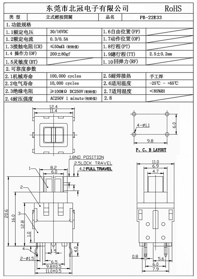 1.Rating : DC 30V 0.1A 2.Contact Resistance: ≤100mΩ 3.Lnsulation Resistance: ≥100mΩ DC500V 4.Operating Temperature Range: -25℃+80℃ 5.Ambient Humidity Used: ≤85%RH 6.Operating Force : 180 ± 50 gf 7.Mechanical Life : 10,000 Cycles 8.Solder Ability:260℃±5℃ 3s