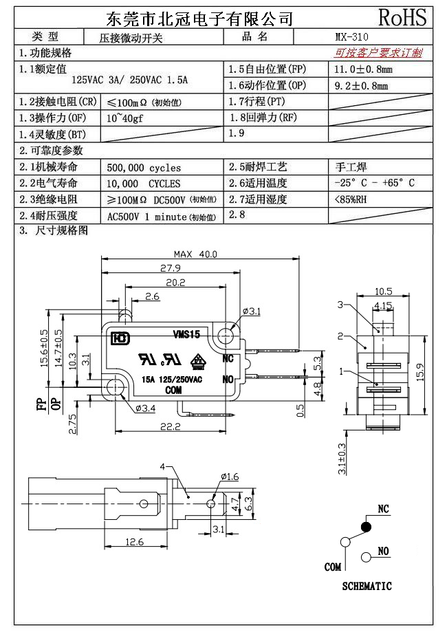 Typical Specifications 1.Rating : DC30V 0.1A 2.Contact Resistance: ≤100mΩ 3.Lnsulation Resistance: ≥100mΩ DC500V 4.Operating Temperature Range: -25℃+85℃ 5.Ambient Humidity Used: ≤85%RH 6.Mechanical Life: 100,000Cycles 7.Operating Force:30±10gf 8.OP:8.8±0.8mm 9.Order: AC 125V 3A