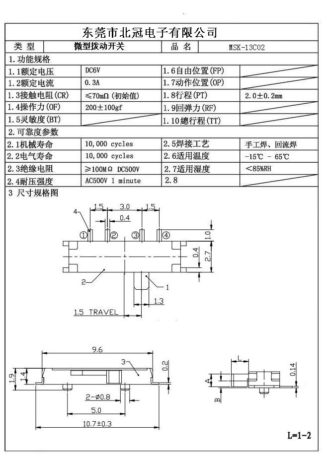 Typical Specifications 1. Rating : DC 12V 50mA 2. Contact Resistance :≤50mΩ 3.Lnsulation Resistance: DC500V 1Minute 4.Operating Temperature Range: -25℃+80℃ 5.Ambient Humidity Used: ≤85%RH 6. Operating Force : 200gf 7. Operating Life : 10,000Cycles